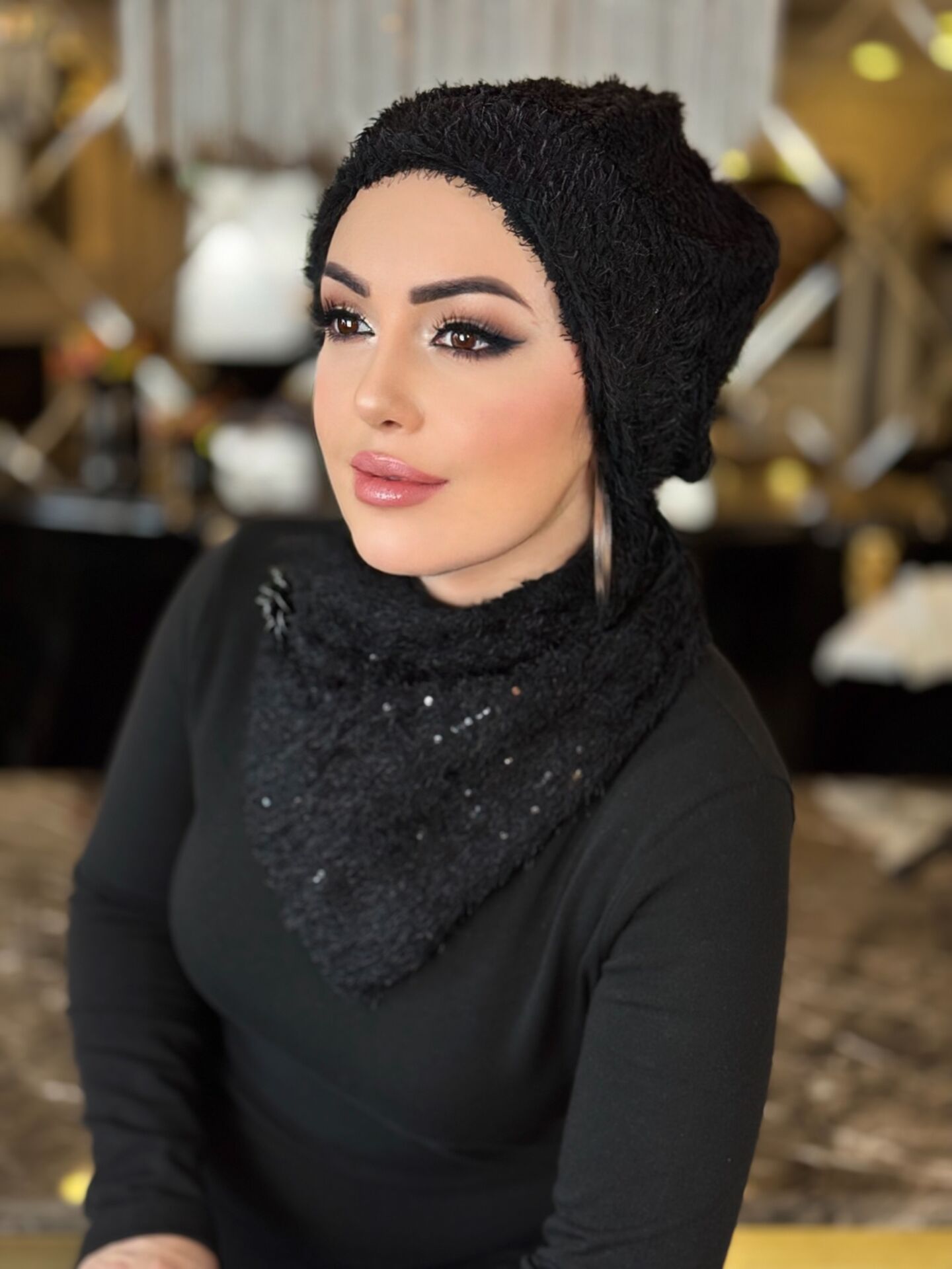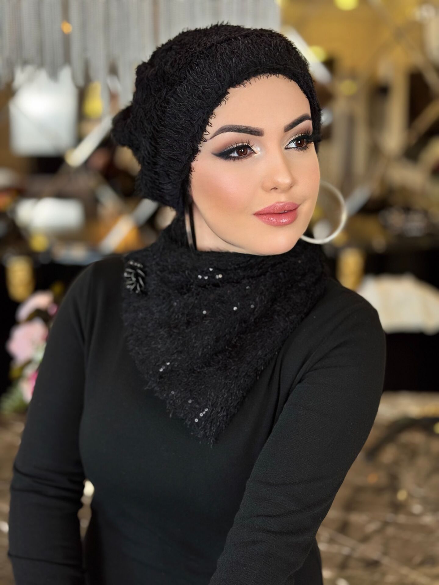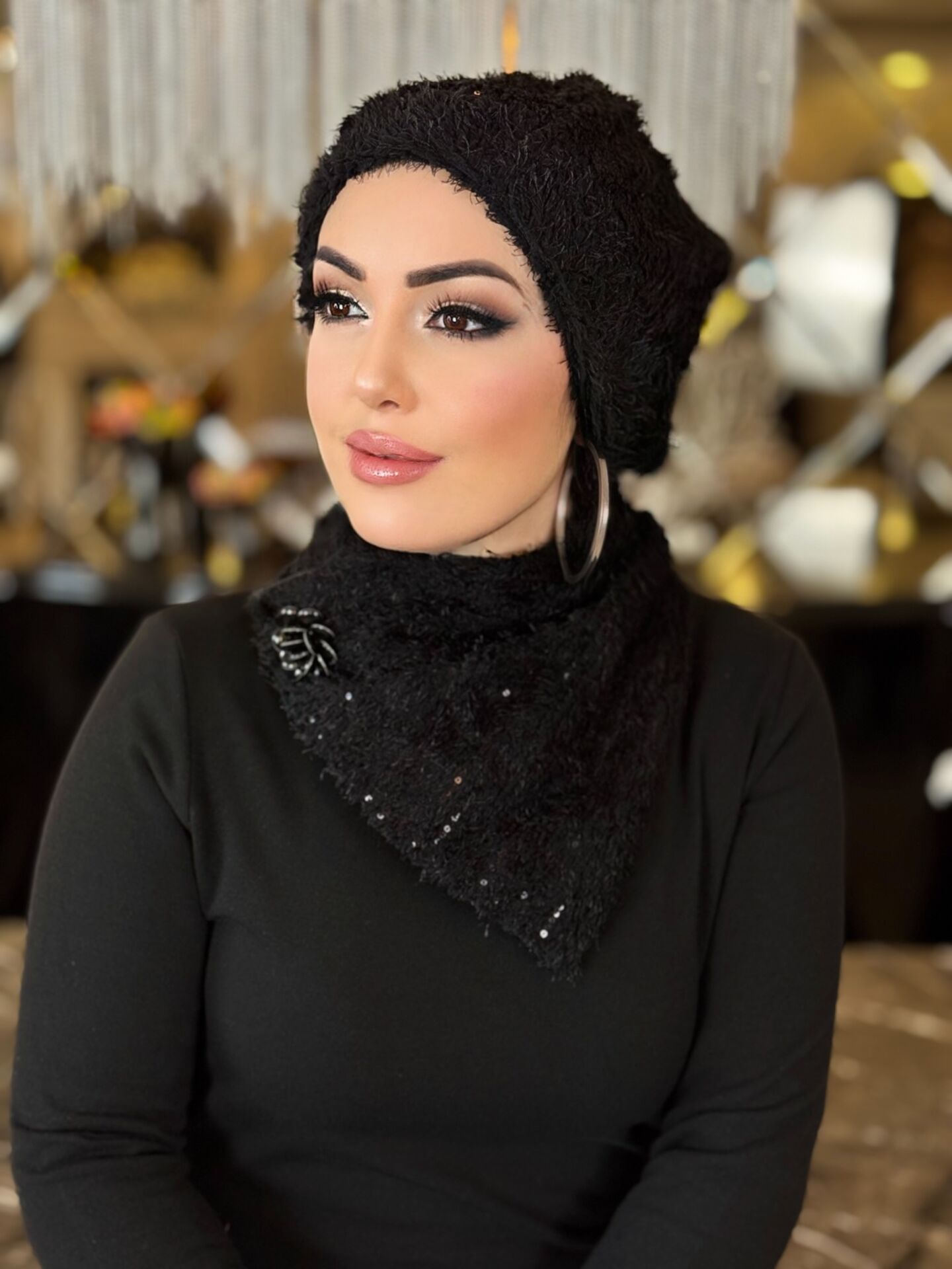 SİYAH TÜYLÜ FULARLI ŞAPKA TAKIM