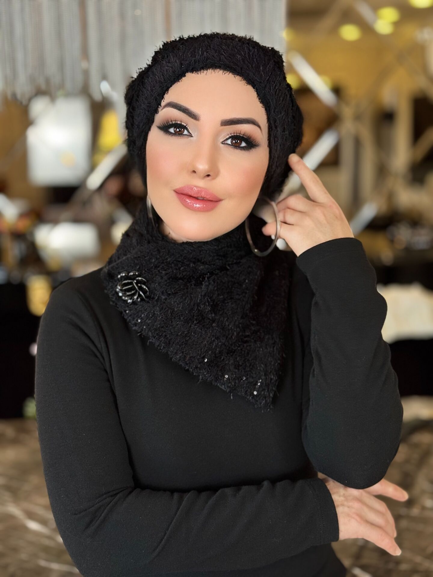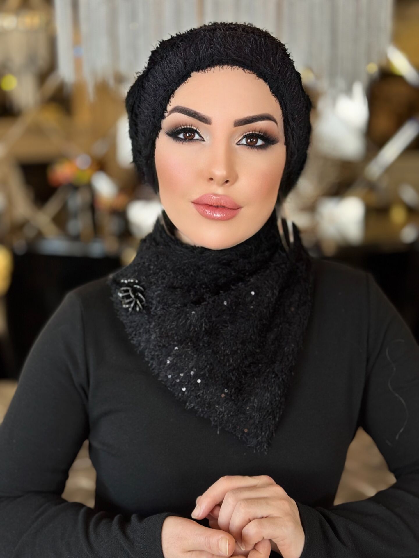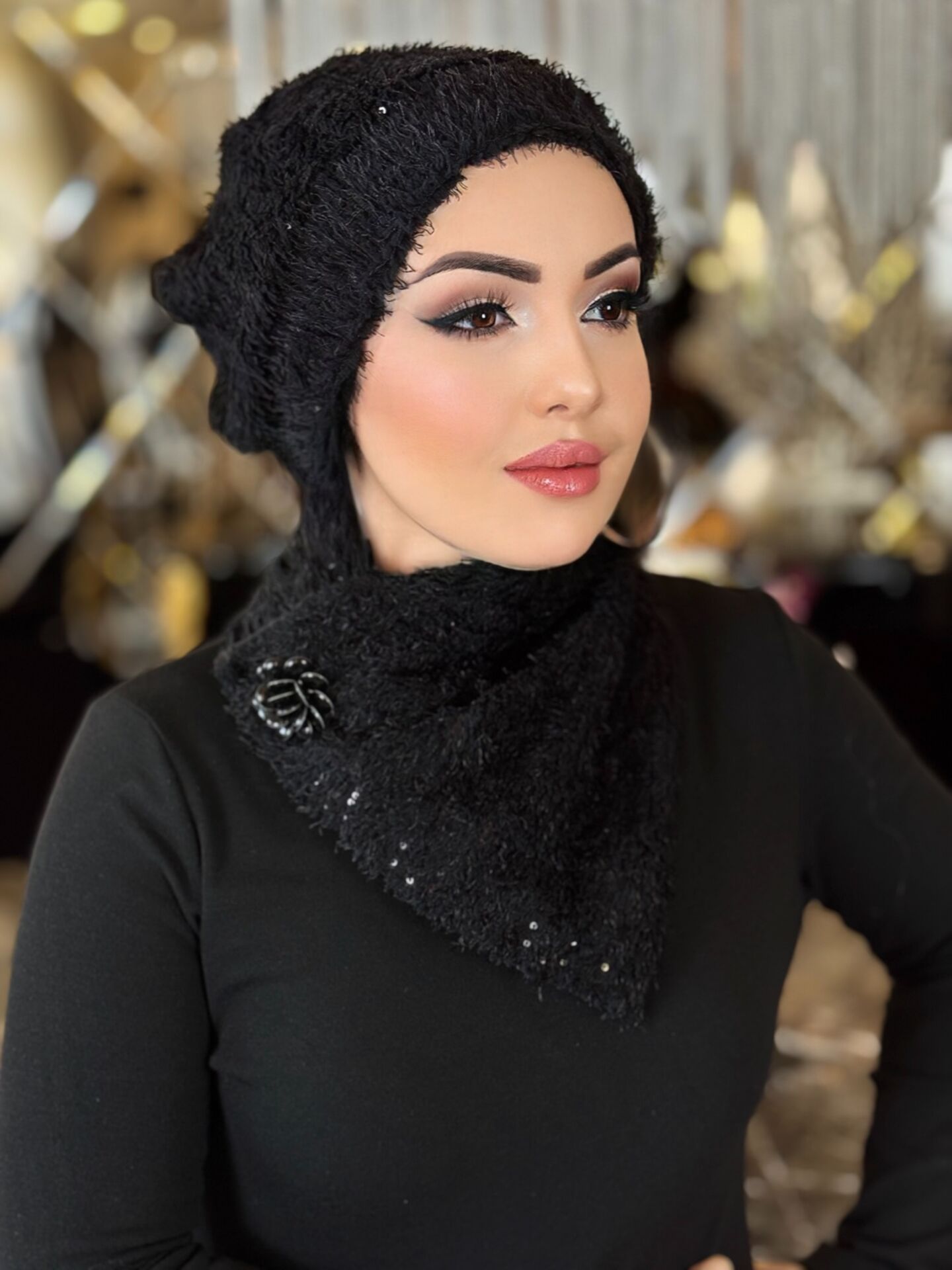 SİYAH TÜYLÜ FULARLI ŞAPKA TAKIM
