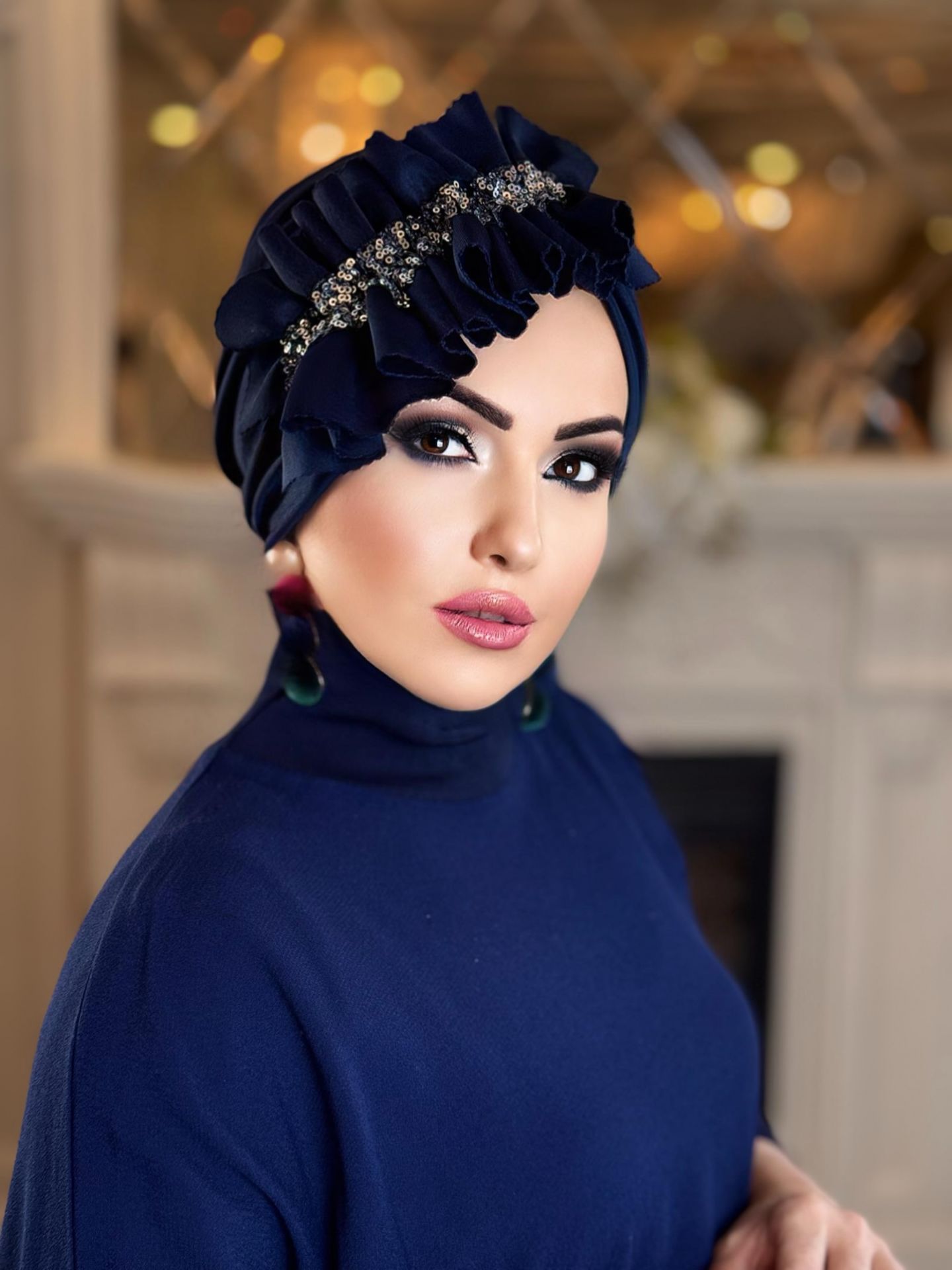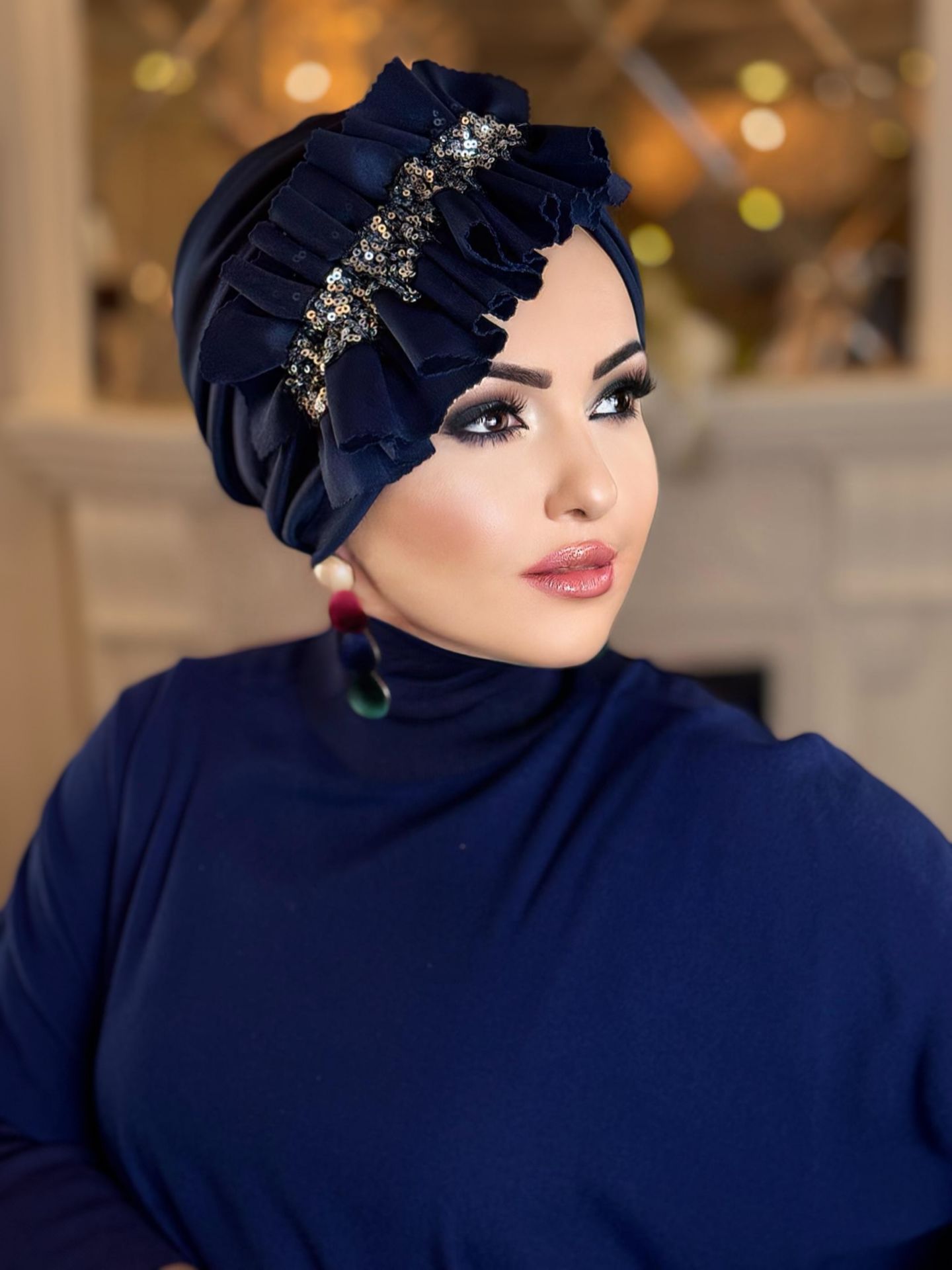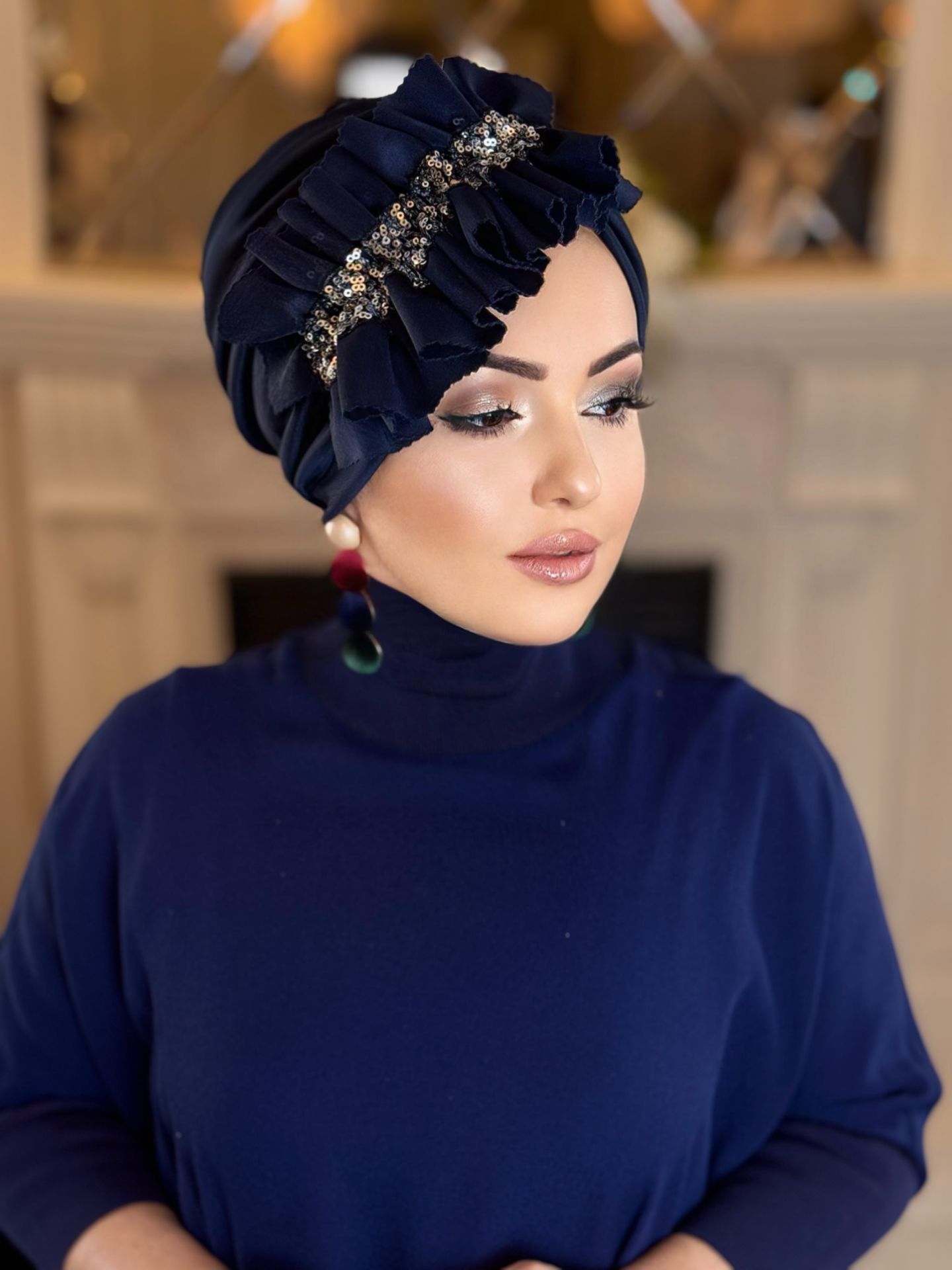 LACİVERT GÜMÜŞ PAYETLİ YANDAN FIRFIRLI BONE