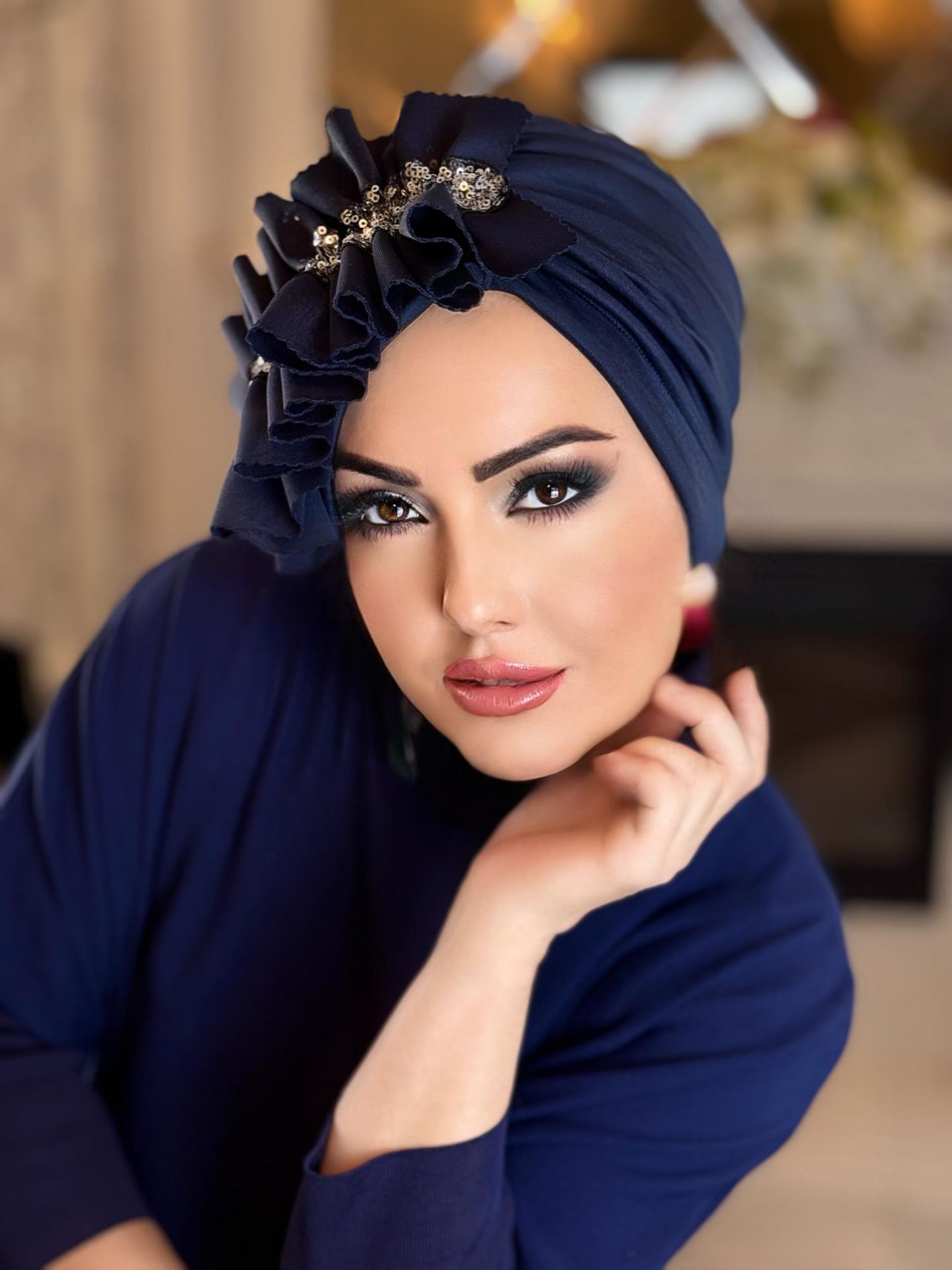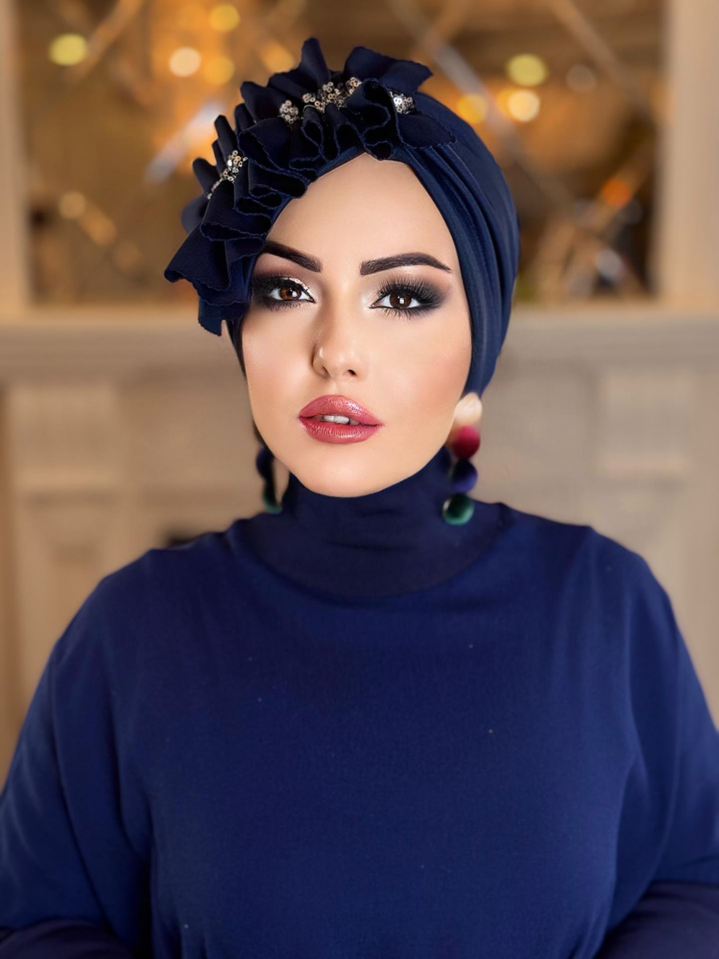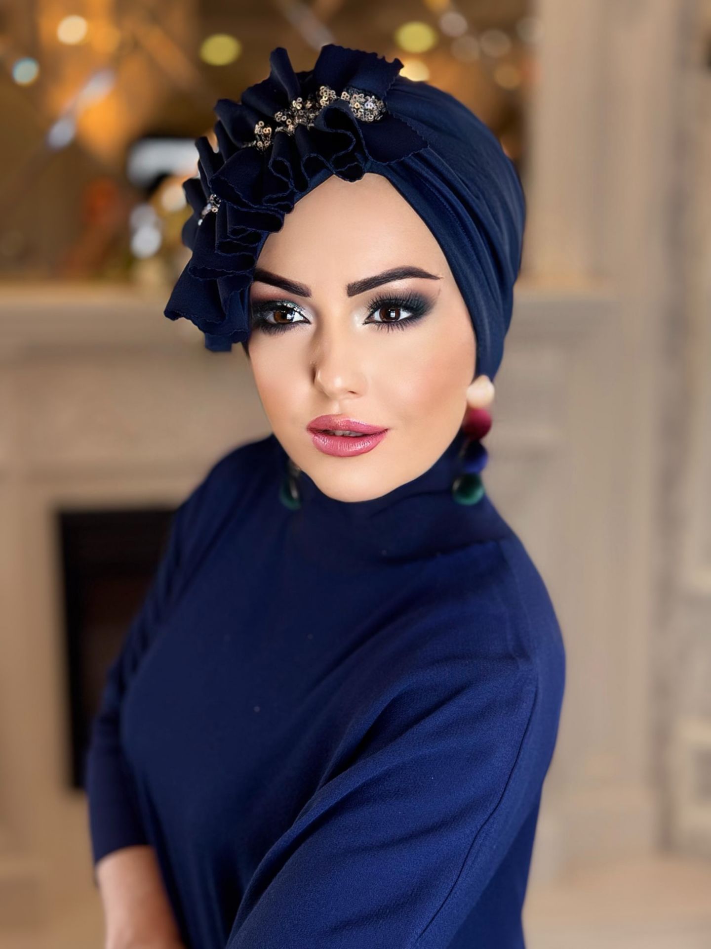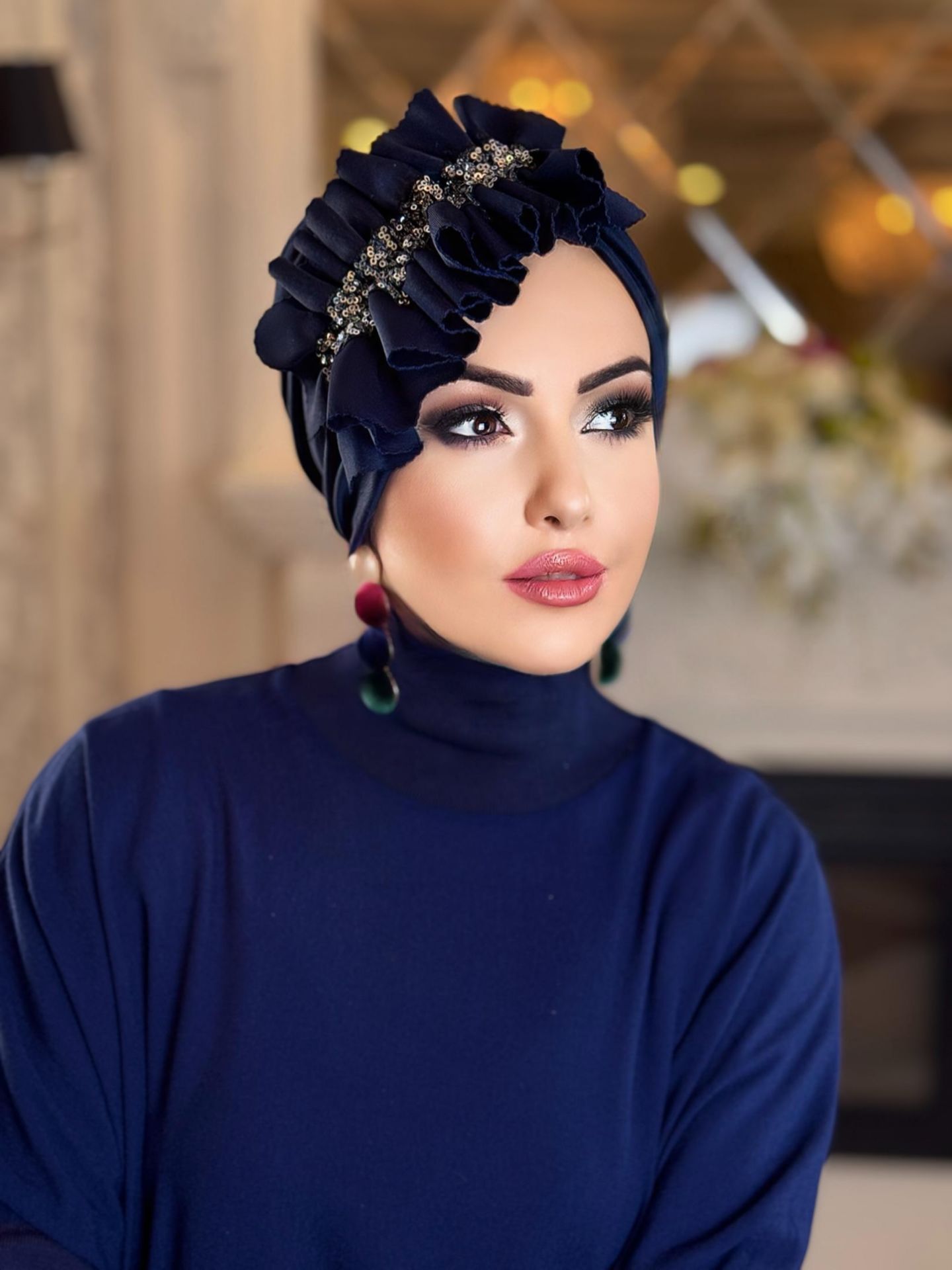 LACİVERT GÜMÜŞ PAYETLİ YANDAN FIRFIRLI BONE